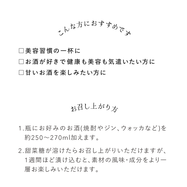瓶にお好みのお酒(焼酎やジン、ウォッカなど)を約250~270ml加え、甜菜糖が溶けたらお召し上がりいただけますが、1週間ほど漬け込むと、素材の風味・成分をより一層お楽しみいただけます。
