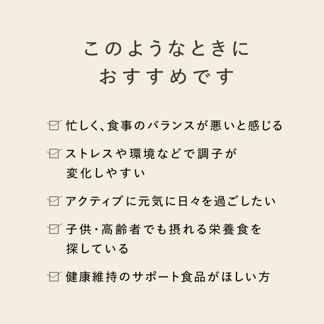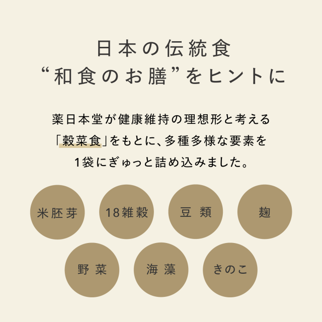 漢方専門店である薬日本堂は、健康を維持するためには、日本の伝統食である「穀菜食」が理想と考え、「穀菜食」をコンセプトに、雑穀や豆類、野菜などの他、普段の食事では摂りにくい和漢素材を独自のバランスで配合し、粉末タイプの健康食品に仕上げました。