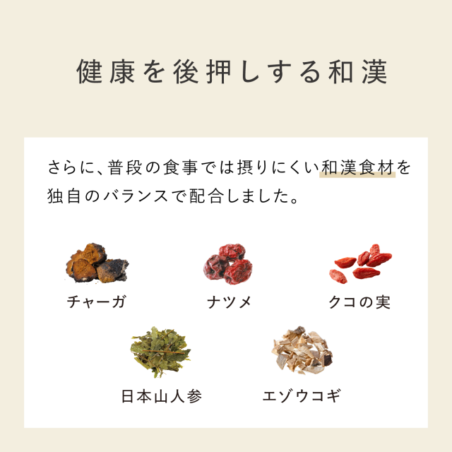 米胚芽抽出物(国内製造)、麦芽糖、還元麦芽糖水飴、デキストリン、穀物麹抽出濃縮物(難消化性デキストリン、玄米麹抽出濃縮物、大豆麹抽出濃縮物)、雑穀加工品(大麦、うるち玄米、発芽玄米、丸麦、胚芽押麦、もち玄米、もち麦、もち黒米、青大豆、もちきび、ハト麦、もち赤米、もちあわ、黄大豆、黒大豆、小豆、ひえ、とうもろこし)、タモギ茸粉末、明日葉粉末、小豆粉末、モズク抽出物、日本山人参(ヒュウガトウキ)葉部粉末、チャーガ粉末、クコの実粉末、エゾウコギ粉末、ナツメ抽出物(デキストリン、ナツメエキス)⁄リン酸Ca、プルラン