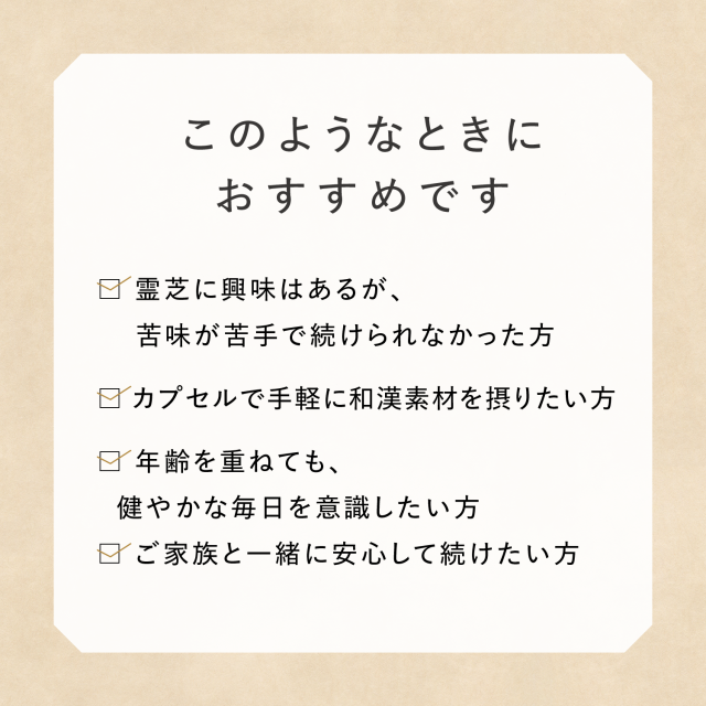 □ 霊芝に興味はあるが、苦味が苦手で続けられなかった方