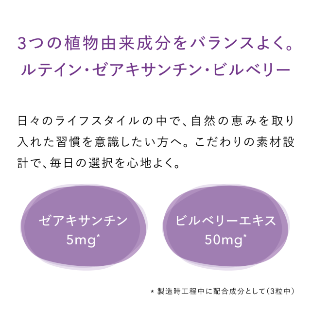 さらに、ゼアキサンチン5mg*とビルベリーエキス50mg*もプラス。