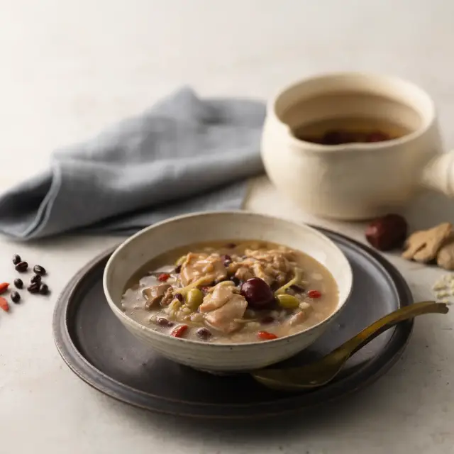 生姜の香りと、なつめ・小豆の自然な甘さが調和した、やさしく奥行きのある和風サムゲタン風味。
