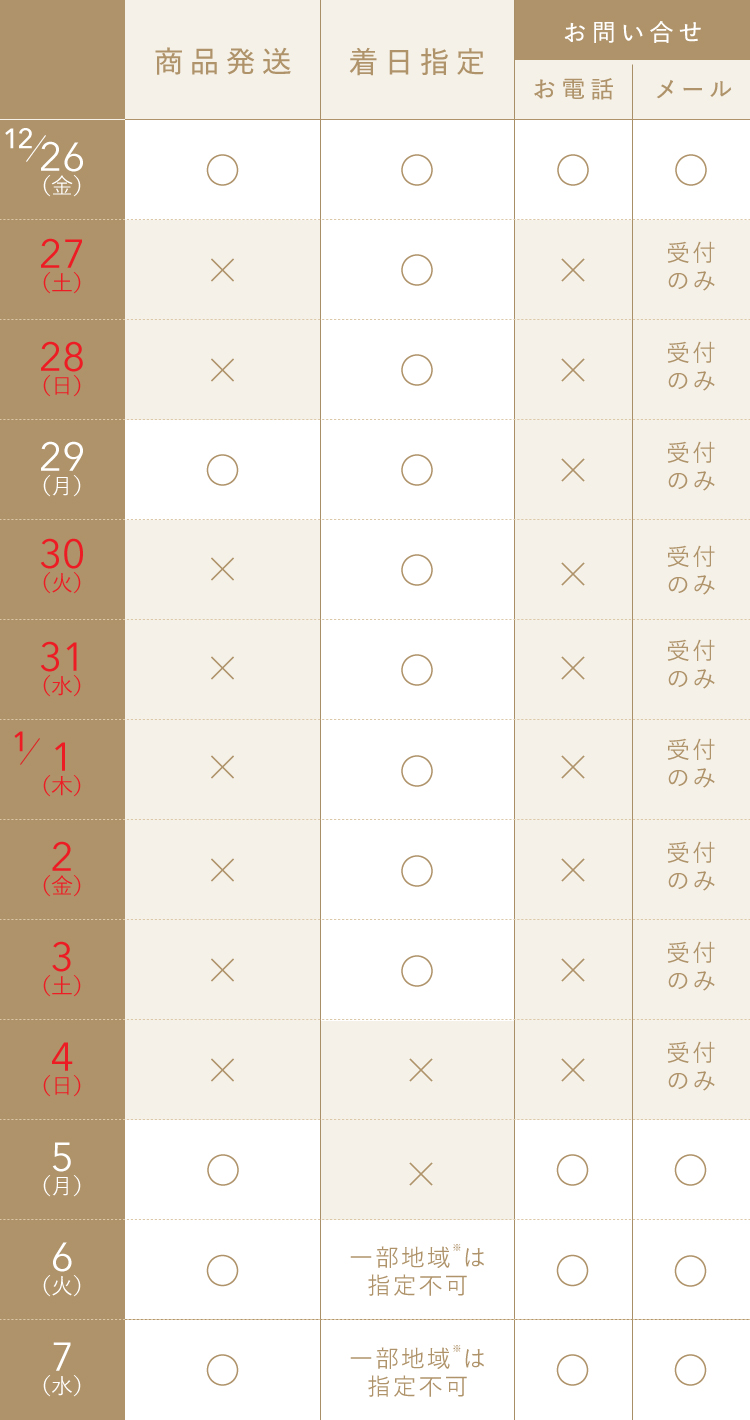 ●年始初発送日が1月5日となるため、1月4日~5日、一部地域*の場合は7日までの着日指定は承ることができません。